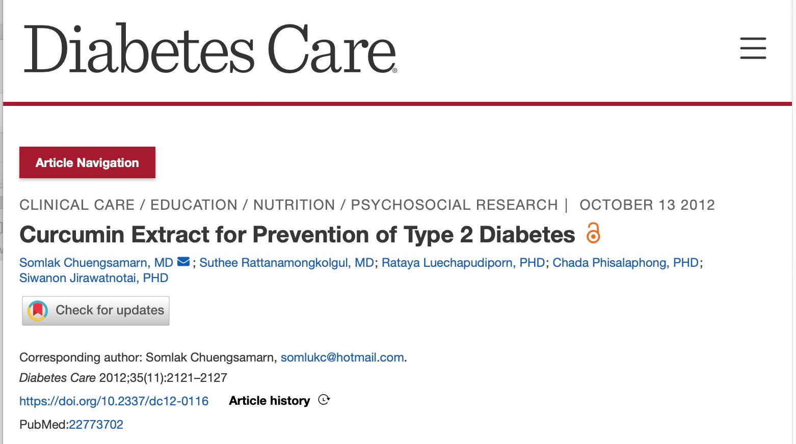 1. Chuengsamarn, S., S. Rattanamongkolgul, R. Luechapudiporn, C. Phisalaphong, and S. Jirawatnotai. “Curcumin Extract for Prevention of Type 2 Diabetes.” Diabetes Care 35, no. 11 (2012): 2121–27. https://pubmed.ncbi.nlm.nih.gov/22773702/.