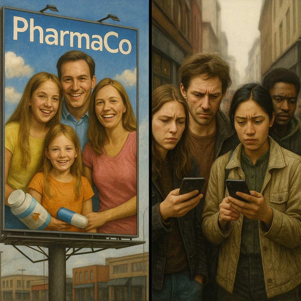 Perhaps nothing illustrates Big Pharma's influence -- and its vulnerability -- better than its advertising empire. The U.S. is one of only two countries in the world that allow direct-to-consumer (DTC) drug ads, and pharma has exploited that freedom to build a $10+ billion marketing engine that blankets American airwaves with drug commercials. In 2024 alone, pharmaceutical companies spent over $10.1 billion on prescription drug ads, with roughly half ($5+ billion) devoted to TV spots and the rest on radio, print, and digital¹⁹.