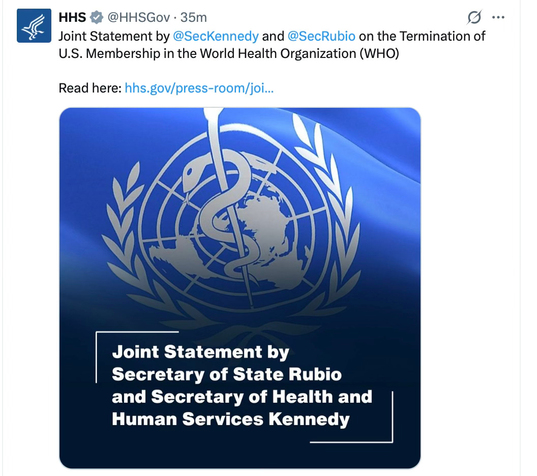 My previous reporting on the exit included Breaking Free: How the WHO Exit Marks a Turning Point⁶ and BREAKING: U.S. Plans WHO Withdrawal on Inauguration Day⁷ where I documented the structural risks of WHO-centric governance and the emerging political momentum toward disengagement.