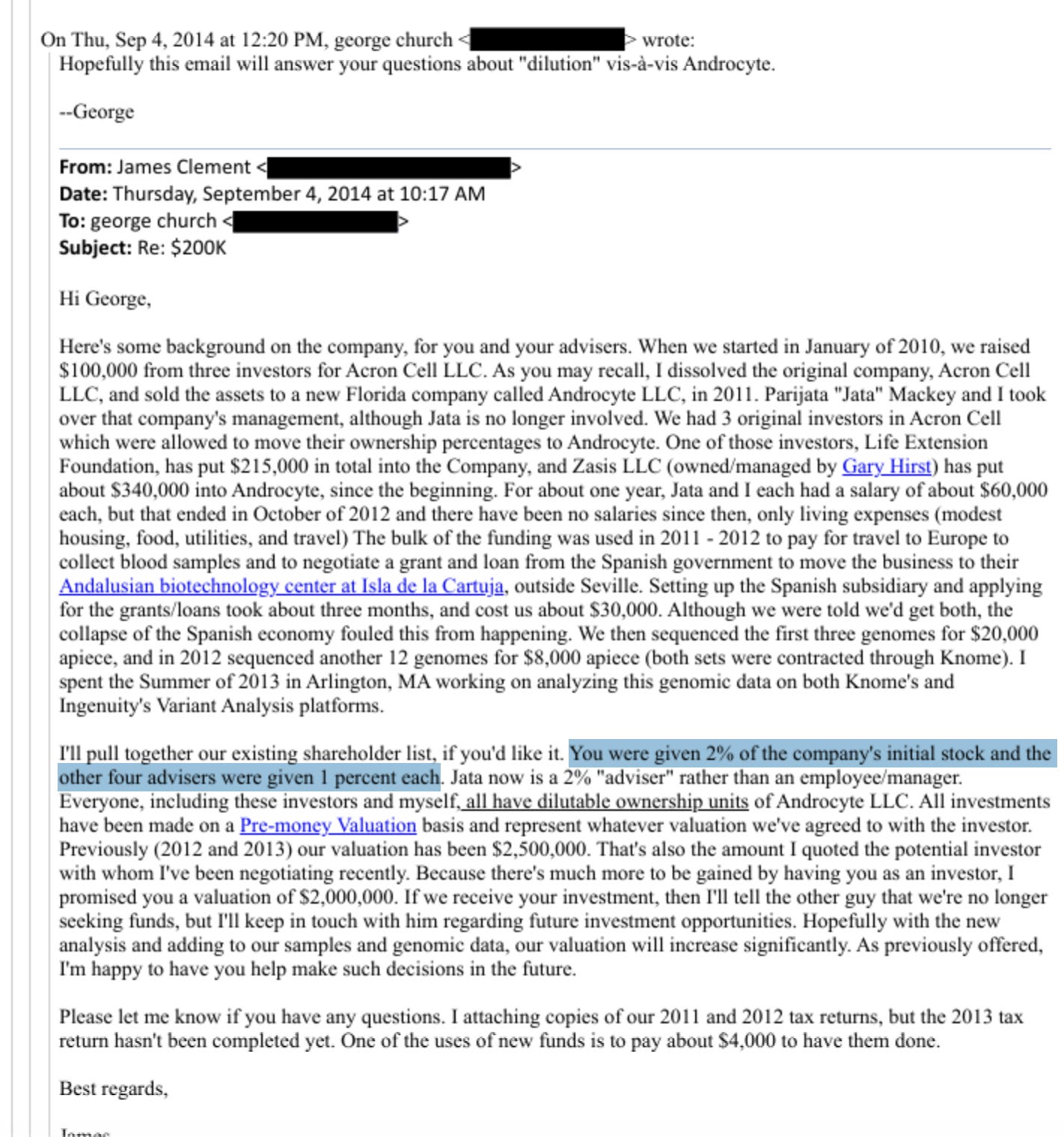 3. George Church / James Clement to Jeffrey Epstein, September 2014 email chain (EFTA00997325). James Clement’s September 4 email states Epstein received 2% of Androcyte’s initial stock. Church’s September 6 email describes the Androcyte CRISPR guide-RNA and human cell-editing pipeline. Epstein’s September 4 reply: “is there and was there a biz plan? how does the co intend to make money? when/? the use of funds, appears more like a research grant than a for profit investment.”