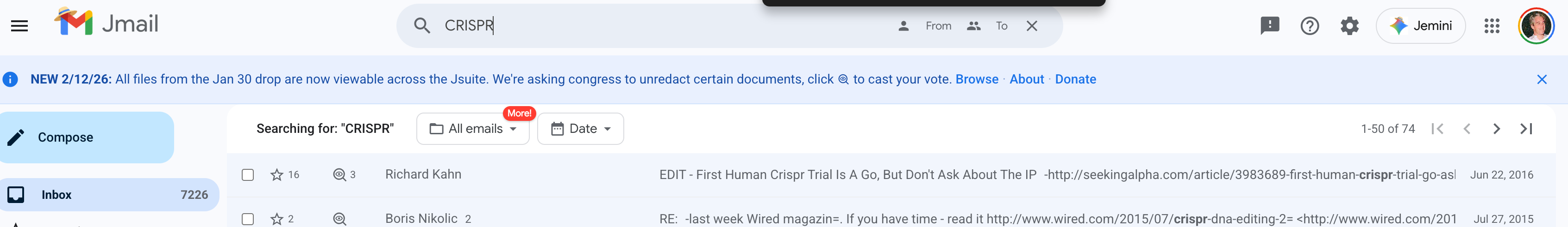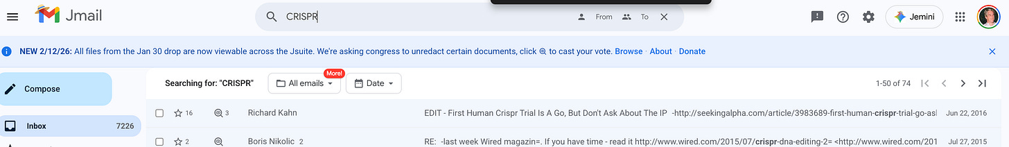 This is the tenth installment in an ongoing series examining what the Epstein files reveal about the architecture connecting private capital, institutional science, and public health infrastructure. Earlier entries have traced the JPMorgan–Gates pandemic finance pipeline, the biosecurity-as-governance framework embedded in Project Molecule, and the classified intelligence trails running through British political networks. What this piece adds is the layer closest to the science itself: a convicted sex offender operating as a connective node inside the laboratories and boardrooms where gene editing was becoming commercially real. The full series is available at sayerji.substack.com/t/epstein-files. The EFTA archive at Jmail.world contains 74 references to CRISPR across the Epstein files. This piece addresses six of them. The remaining record is public and searchable.
