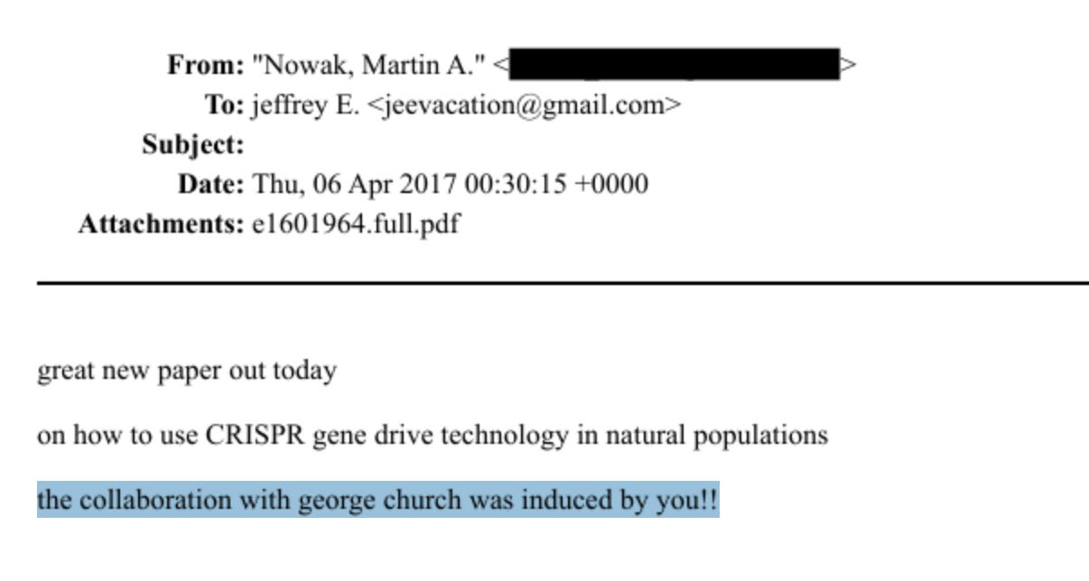 On April 6, 2017 — exactly one year after the Sheldrake exchange — evolutionary biologist Martin Nowak wrote to Epstein to share a new paper on CRISPR gene drive technology in natural populations. The paper itself concerns one of the most consequential and contested applications of genetic engineering: the use of gene drives to alter inheritance patterns across wild populations, with potential ecological effects that are, by design, difficult to reverse.