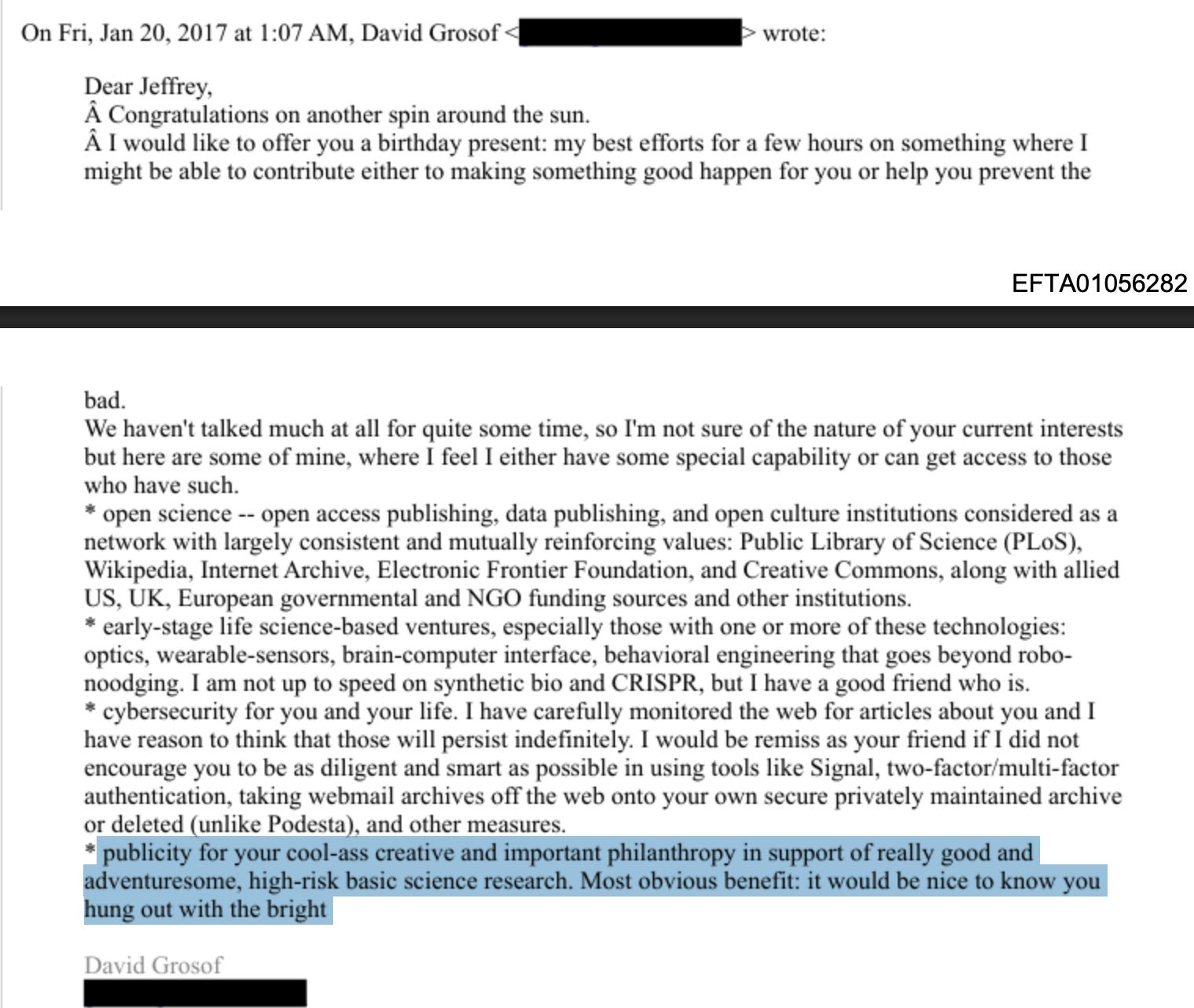5. David Grosof to Jeffrey Epstein, January 20, 2017 (EFTA01056271 / EFTA01056282). Birthday email offering assistance in several domains including publicity for Epstein’s science philanthropy and cybersecurity improvements. Epstein’s areas of interest listed in reply: distributions in nature, deception, sleep, power, money, music and the brain, signal intelligence in biological systems.