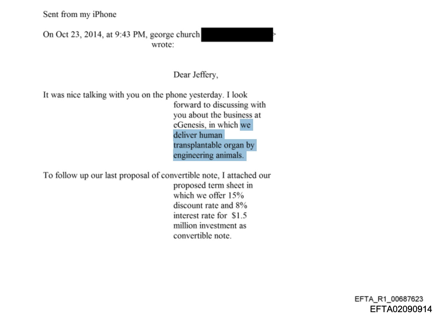 4. George Church / Luhan Yang to Jeffrey Epstein, October–November 2014 (EFTA02090913). Church’s October 23 email describes eGenesis as delivering “human transplantable organ by engineering animals” and proposes either a $1.5M convertible note (15% discount, 8% interest) or 9.09% preferred equity at $15M pre-money valuation. Epstein’s relayed reply requests use-of-funds projections and states he will “send a structure that i believe works.” Business plan file explicitly labeled: 20141101_eGenesis Inc_shared with Jeffery Epstein.pdf.