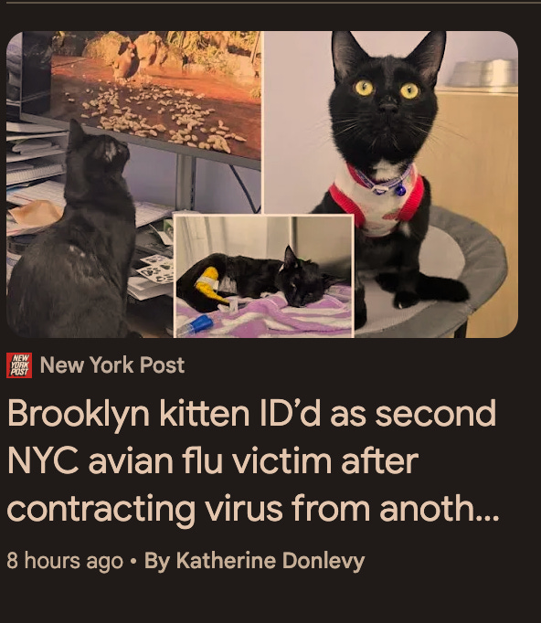 In yet another example of modern journalism’s descent into hysteria-driven reporting, the New York Post has published an article titled, "Brooklyn Kitten Contracted Avian Flu from Another Infected Cat", which attempts to sound the alarm over a supposedly ominous case of feline-to-feline transmission of H5N1. At first glance, the story appears to provide a straightforward report on a veterinary health concern. However, upon closer examination, it reveals a familiar pattern in mainstream media: the abandonment of scientific skepticism, the exaggeration of risks, and the subtle reinforcement of pandemic-era fear narratives.