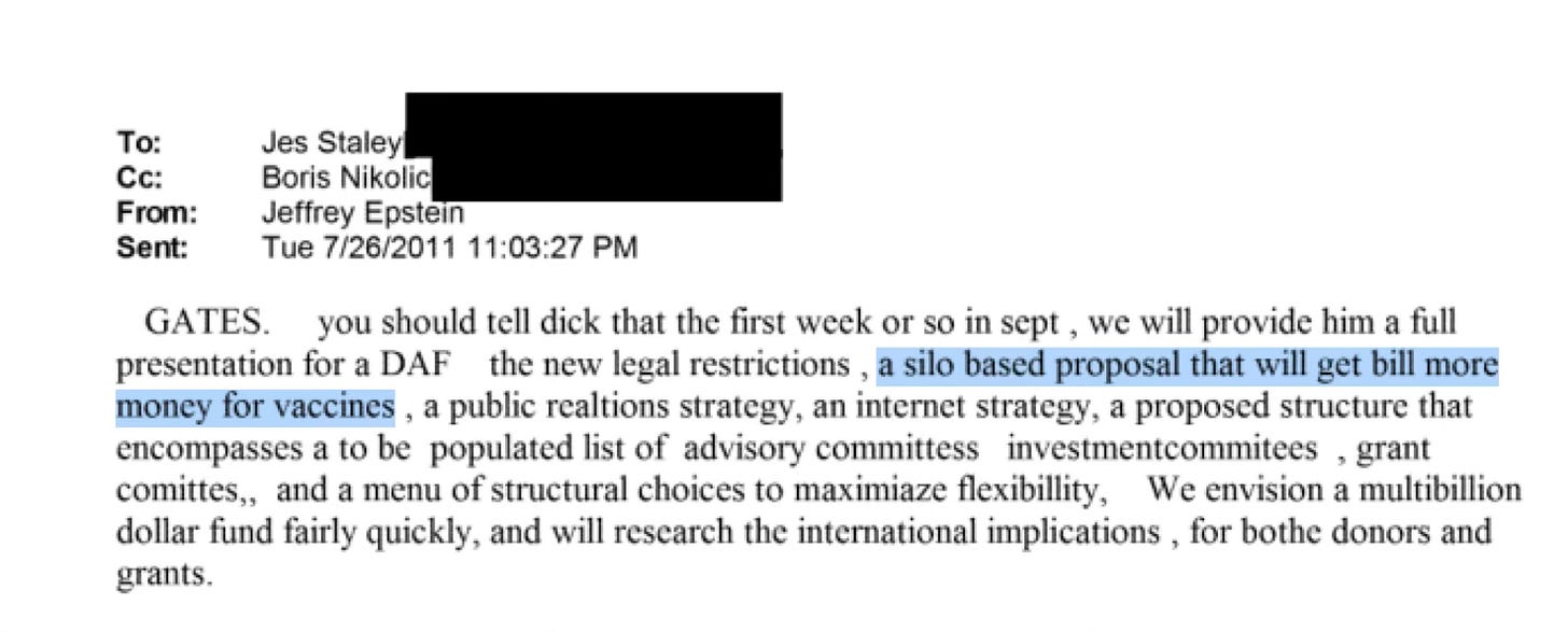 Vaccines were the hook — the narrative justification for the financial structure. Eleven days earlier, he had described the fund as “a silo based proposal that will get Bill more money for vaccines” (EFTA01860211).
