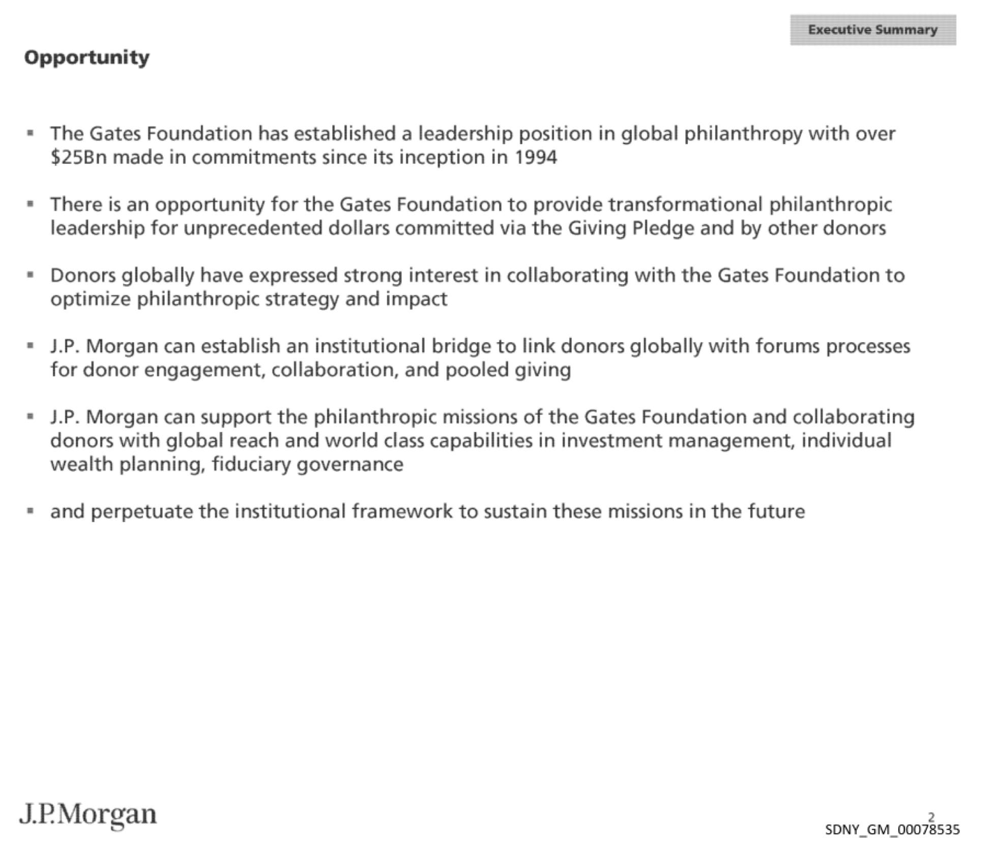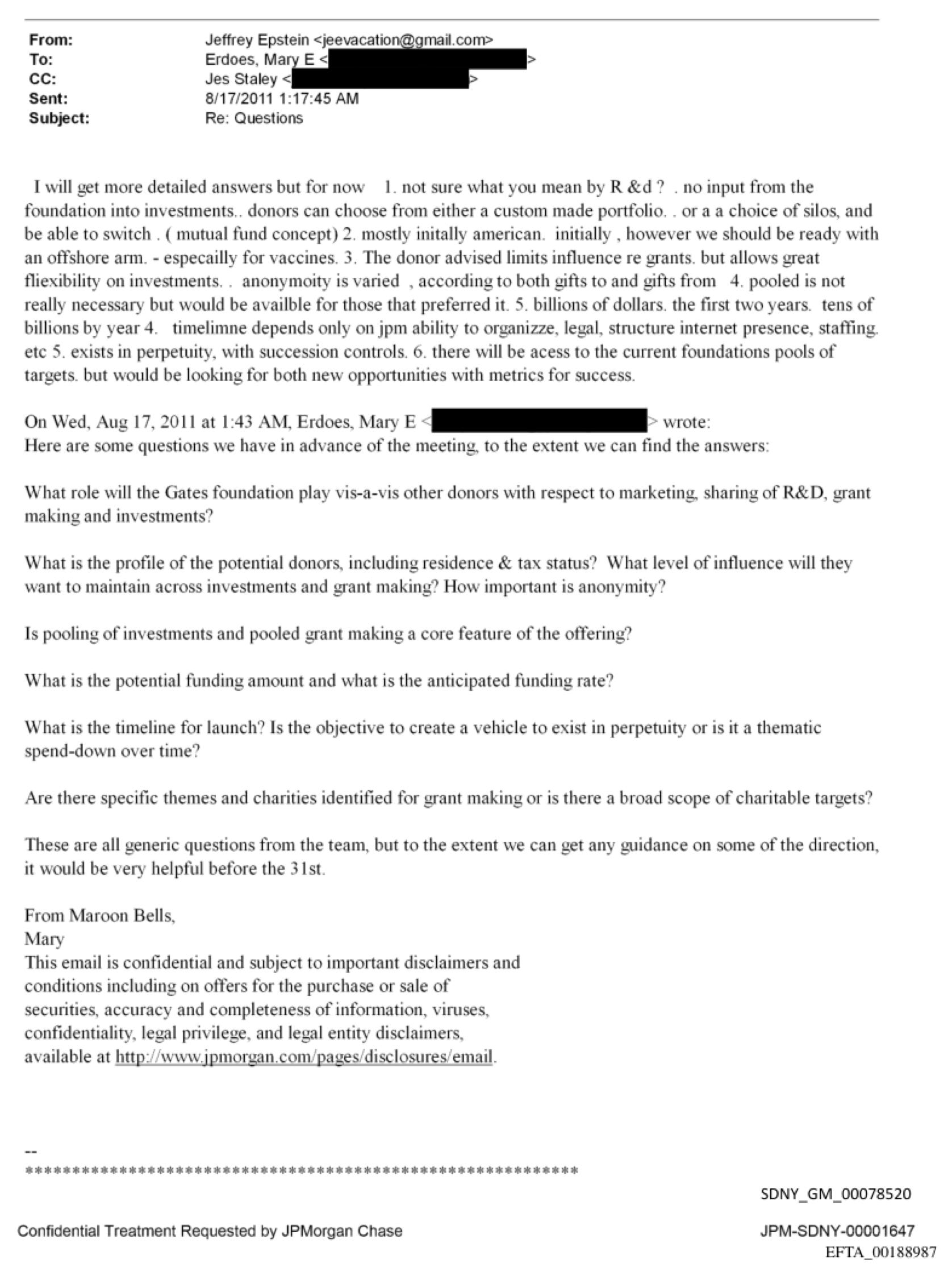 Remember how this relationship worked. In February 2011, JPMorgan sent Epstein a structured questionnaire — at Jes Staley’s direction — asking him to define the architecture of a Gates-linked fund. He replied the same evening with a fully formed vision. By August, Erdoes was emailing him directly — from vacation — asking for answers before the 31st. She got them the same night, from a man whose email signature read: “It is the property of Jeffrey Epstein.”