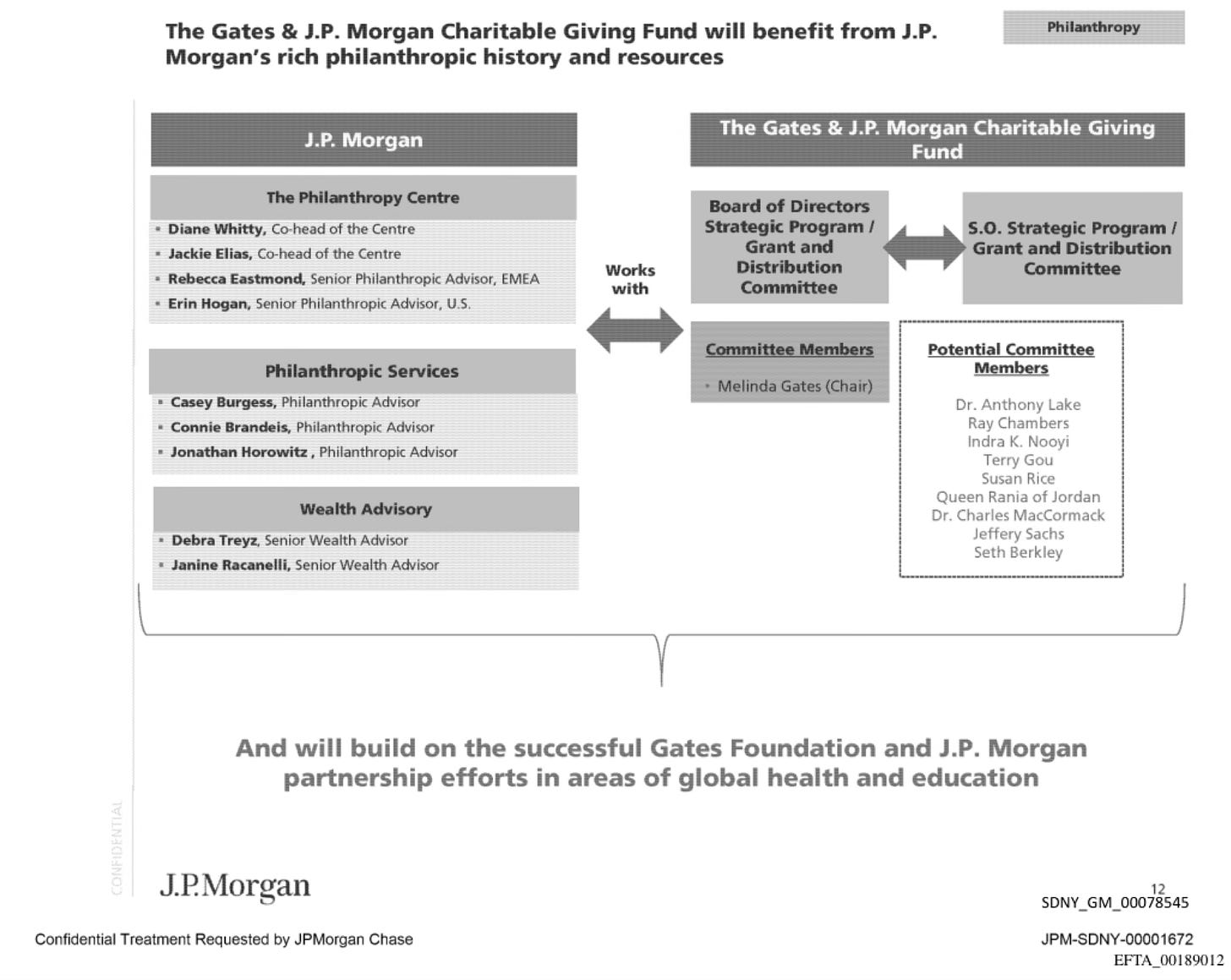 The deck’s objectives include leveraging “J.P. Morgan’s global reach, infrastructure investment management, and individual wealth structuring capabilities” and creating structures to “accept, manage, and liquidate unique and/or illiquid assets.” The minimum gift threshold: $100 million. The entity name: “The Gates & J.P. Morgan Charitable Giving Fund.”