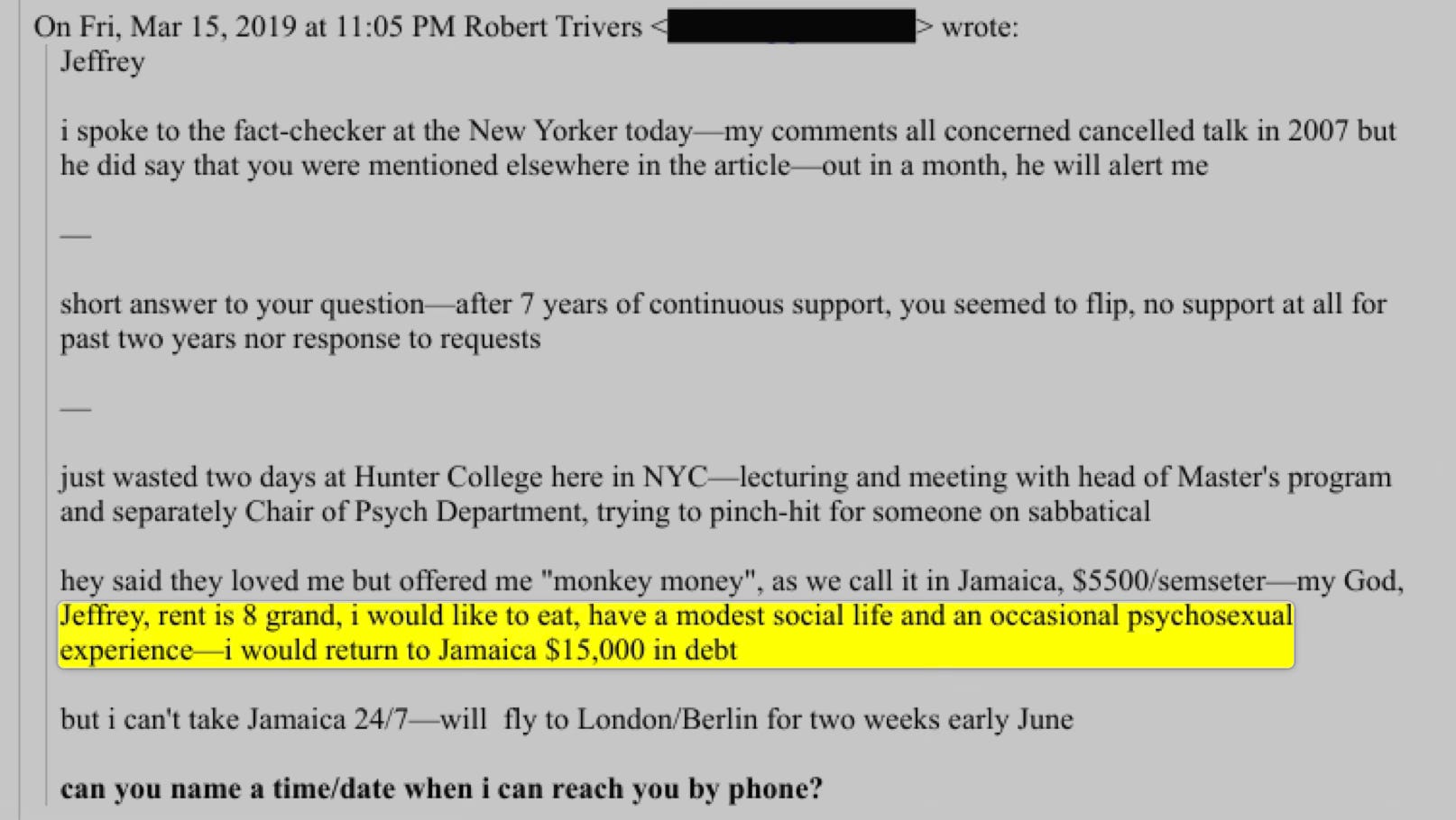 Three years later, the leverage became explicit. On March 15, 2019, Trivers wrote to Epstein in desperation (EFTA01035762): “after 7 years of continuous support, you seemed to flip, no support at all for past two years nor response to requests.” He described being offered “$5500/semester” at Hunter College — “my God, Jeffrey, rent is 8 grand, i would like to eat, have a modest social life and an occasional psychosexual experience.”