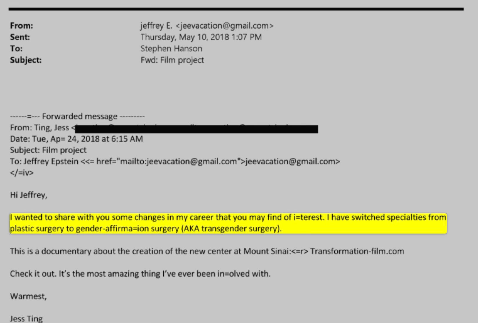 On May 10, 2018, Epstein forwarded Ting’s email to Stephen Hanson — a close associate. The subject line: “Fwd: Film project.” Epstein wasn’t passively receiving updates from a surgeon. He was circulating information about the transgender surgery program within his network. The forwarding of this email transforms it from a one-way communication into evidence of active engagement — Epstein sharing, routing, and potentially brokering connections around transgender medicine.