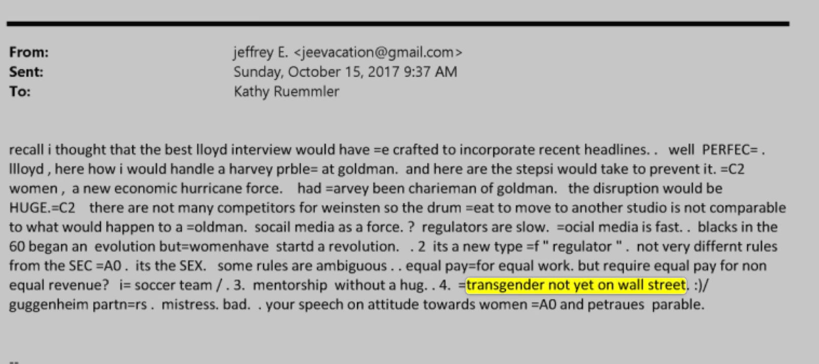 The smiley face is the detail. Epstein isn’t observing a social trend. He’s tracking transgender as a force that hasn’t yet hit the financial industry — with evident amusement. In the same email, he discusses women as “a new economic hurricane force,” mentorship, equal pay, and the new power of social media as a “regulator” — framing the entire landscape, including transgender issues, through the lens of disruption and opportunity.