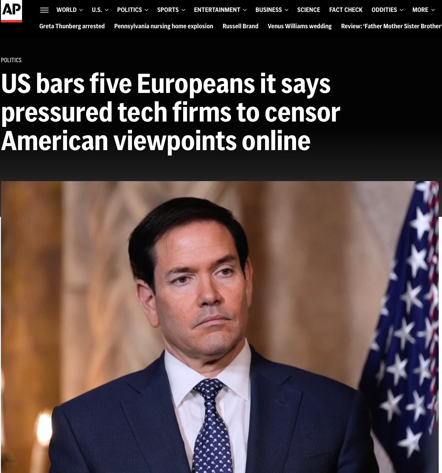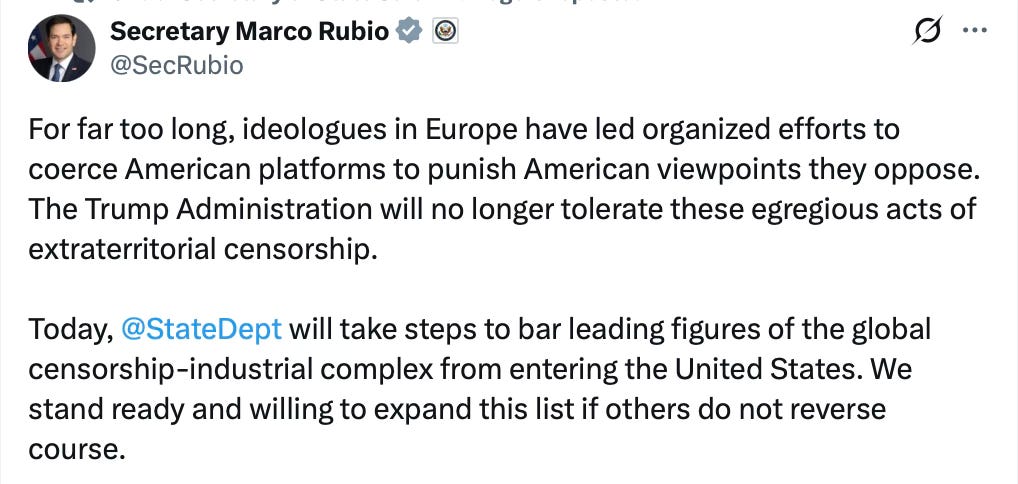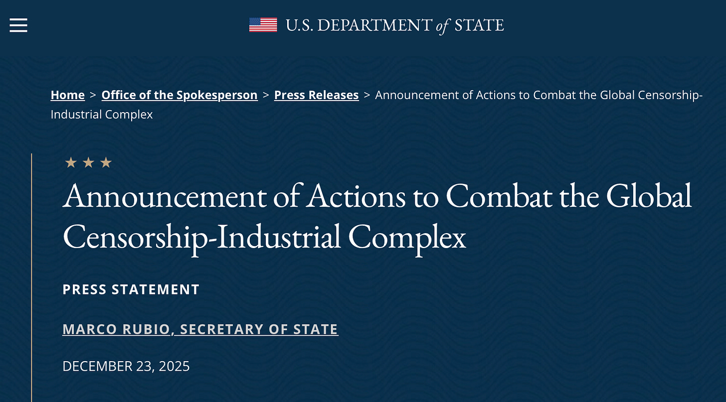 The action follows today’s formal announcement by Secretary of State Marco Rubio outlining a sweeping effort to confront what the administration has labeled the “global censorship-industrial complex”—a transnational network of foreign activists, NGOs, and regulators accused of coercing American platforms to silence constitutionally protected expression.