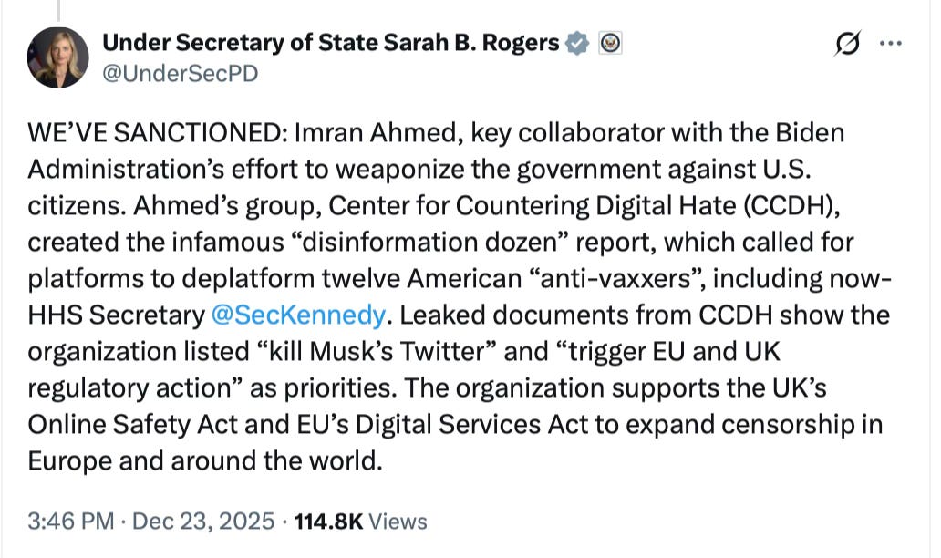 Under Secretary of State for Public Diplomacy Sarah B. Rogers—whose recent actions have placed her at the forefront of the U.S. government’s defense of the First Amendment—issued the following statement on X today, explicitly citing the “Disinformation Dozen” campaign and CCDH’s targeting of lawful American speech as key grounds for the sanctions: