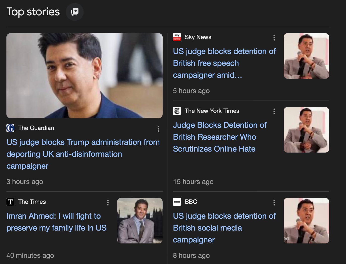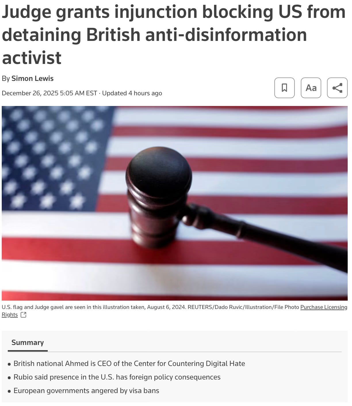 In the days since I published “Imran Ahmed, CCDH’s Censorship Architect Pleads the First Amendment”, the story has moved quickly—and predictably. A federal judge has now issued a temporary restraining order, briefly blocking the Trump administration from detaining or removing Ahmed while the court considers his request for broader injunctive relief. A hearing is scheduled for December 29, where the court will decide whether to extend that pause into a preliminary injunction. (View the restraining order here)