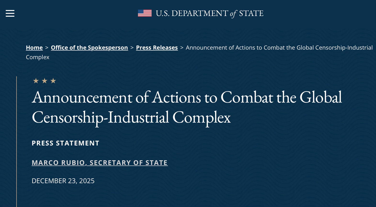 In fact, the State Department has been explicit about the basis for this action. In its December 2025 announcement on combating the “global censorship-industrial complex,” the Department stated that visa restrictions may be imposed on foreign actors who coordinate coercive pressure campaigns against American speech and American companies, citing serious adverse foreign-policy consequences as the governing standard (announcement here).