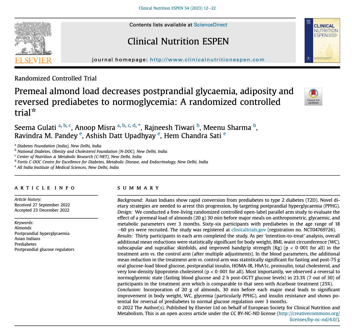 Consuming 20 grams of almonds 30 minutes before meals led to statistically and clinically significant improvements in glycemic control in individuals with prediabetes—including a 23.3% reversal to full normoglycemia in just 90 days.
