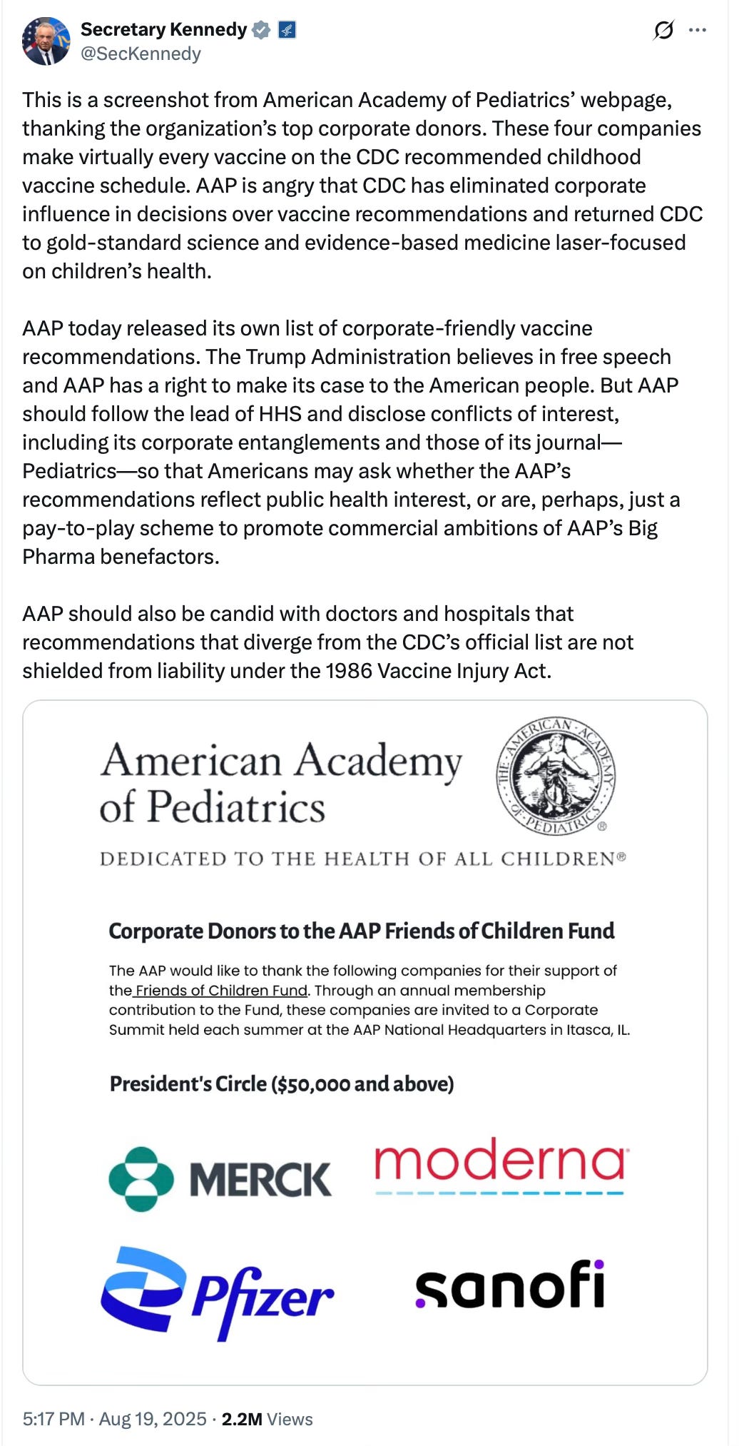 In August 2025, Secretary Robert F. Kennedy Jr. shared a screenshot from the American Academy of Pediatrics’ website identifying its top corporate donors—four companies that collectively manufacture nearly every vaccine on the CDC’s recommended childhood immunization schedule