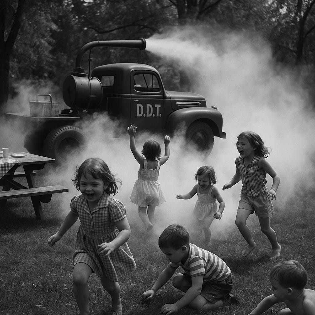 Fast forward to the 1940s and 1950s, the peak polio era in the U.S. This was the age of DDT: the "miracle" organochlorine pesticide that governments sprayed with abandon after WWII. From 1945 onward, the U.S. underwent what one physician called "the most intensive campaign of mass poisoning in known human history" -- tons of DDT (along with other insecticides like BHC) were dumped on crops, homes, and even directly on children12,13. Famously, trucks fogged entire neighborhoods with DDT while kids chased behind the sweet-smelling clouds for fun.